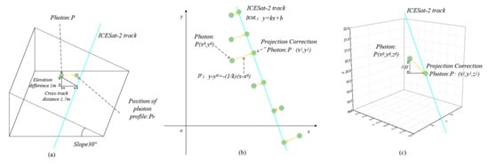 The vertical mapping point of the photon on the track was first determined. The photon position and the reference ground track (RGT) of the ATL03 data are displayed in the XY plane. By considering that on the XY plane, the actual position of the photon is P(x0, y0) and the theoretical position converted to the profile photon is P’(x1, y1), the mapping function (cf. Equation (1)) can be used to express the mapping relationship between the actual position and the theoretical position (cf. Figure 4b). was used to fit RGT to obtain the parameters. Equation (2) was then used to obtain the coordinates of the mapping point.