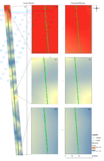 Finally, the elevation difference between the initial photon point and the mapped point was calculated using Equation (3). No matter how the slope between the initial photon point and the mapped point changes, the absolute elevation difference between the two points did not change. Therefore, this difference was used as the correction value. The correction value of each photon was subtracted from the photon height in the initial ATL03 data (cf. Equation (4)) to obtain the corrected height value, which was used as the elevation (Ec) of the mapping point, and (x1, y1, Ec) was the ATL03 correction data. The correction data of each initial photon was obtained according to these steps. Figure 5 shows the corrected photon position. We then verified whether this idea helps to improve the ground extraction accuracy by comparing the differences in ground extraction from the initial ATL03 data and the corrected data, and the requirements to correct the initial photons are discussed.