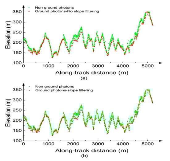 Afterward, the slope filtering method was used to filter the possible ground photons obtained in the previous step, and to remove the photons near the ground surface vegetation. The existing methods directly perform the interpolation based on the possible ground photons to generate continuous ground readings [,,]. However, it is different from the uncertainty of sudden increase or sudden decrease in the top shape of the canopy by considering that the topographic undulation has a certain continuous smoothness (or the correlation between adjacent data points). Therefore, two filtering methods based on slope were designed to eliminate the influence of near-ground vegetation points, wrongly divided into ground points. The first method consists of calculating the slope of the possible ground photons, using the maximum slope corresponding to the ALOS PALSAR DEM in the study area as the threshold, and marking the points less than the threshold as ground photons. This method is referred to as the slope filtering method A, and referred to as SFMA in the sequel. The second method is based on SFMA results. More precisely, the maximum value of slope change in the reference elevation data ALOS PALSAR DEM was used as the threshold, and the points less than the threshold a were marked as ground photons. This method is referred to as slope filtering method B, and referred to as SFMB in the sequel. Finally, the cubic spline interpolation was used to fit the ground photons to obtain a continuous ground. In the sequel, the significance of slope filtering for selecting ground photons was assessed, and the data filtering ability of the two methods was compared.