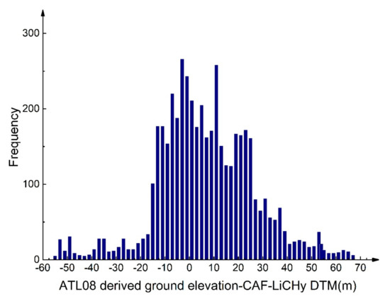 In order to further evaluate the performance of the ATL08 data product in extracting the surface, the DTM derived from the airborne lidar (CAF-LiCHy) was used to verify the accuracy of the ground elevation. Table 1 summarizes the quantitative statistics of the ground elevation error. Figure 9 presents the frequency histogram of the ground elevation error of the ATL08 data product. It can be observed from Table 1, and Figure 8 and Figure 9 that a certain consistency exists between the ground elevation estimated by the ATL08 product and the airborne lidar-derived DTM. The R2 was higher between ATL08-DTM and CAF-LiCHy-DTM. However, the bias, MAE, and RMSE were, respectively, 13.06 m, 17.59 m, and 20.97 m, all showing large errors. The combination of Figure 8 and Figure 9 shows that the ATL08 products cannot accurately describe valleys and peaks, to a certain extent.