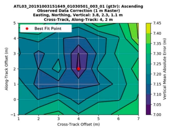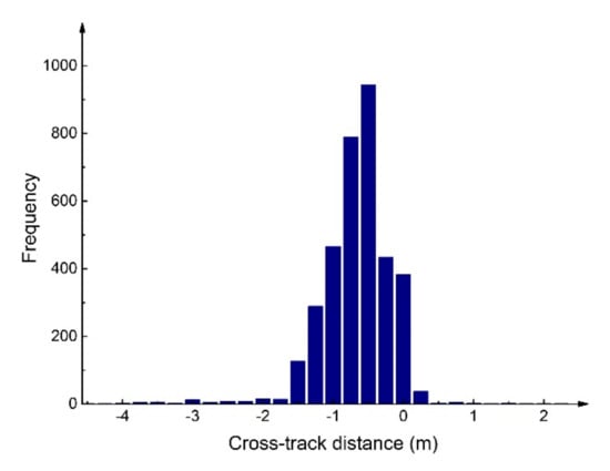 The geolocation accuracy of the ICESat-2 data was verified by comparing it with the high-resolution airborne lidar dataset. The accuracy level of these datasets was within the performance accuracy range of the space-based system (6.5 m). The geolocation accuracy is presented in Figure 10. In this area, the error of ICESat-2 in the cross-track direction was 4 m, and the error in the along-track direction was 2 m. The red dot represents the best-fit point. Figure 11 presents the frequency distribution diagram of the cross-track distance of the ATL03 data in the study area. The photons with the highest frequency were divided between −0.25 m and −0.50 m, accounting for 26.5% of the total. The photons with farther cross-track distances had a greater the distribution number. Taking into account the limited spatial resolution of the reference elevation data, the photons with a cross-track distance greater than or equal to ±0.5 m were corrected, and the photons with a cross-track distance less than ±0.5 m were not corrected. The corrected photons accounted for 44% of the total. The correction values were distributed in −2 m~4 m.