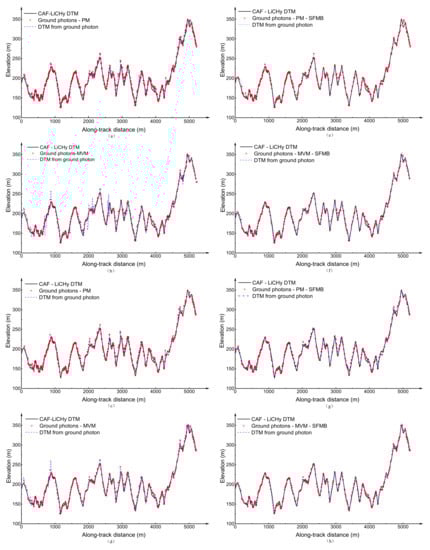 It can be observed from Figure 12a–d that the ground photons extracted from the initial data and corrected data were overestimated at the mountain peaks. The ALOS PALSAR DEM was used as reference data to perform slope filtering on the extracted ground photons. The SFMB slope filtering results are presented in Figure 12e–h. Table 3 summarizes the quantitative statistics of the ground elevation errors after the SFMA and SFMB slope filtering on the basis of the ground obtained by the PM and MVM methods for the photon data before and after correction. After using the SFMA method to filter the ground photons extracted based on the initial data, the MAE and RMSE were reduced by an average of 0.93 m and 1.19 m, respectively. After treatment using the SFMB method, the MAE and RSME decreased by 0.14 m and 0.21 m, respectively, on the basis of the SFMA method. This shows that the proposed slope filtering method is efficient for improving the accuracy of ground photon extraction. After using the SFMA method to filter the ground photons extracted based on correction data, the MAE and RMSE were reduced by 0.80 m and 1.20 m on average. After treatment using the SFMB method, the MAE and RMSE were reduced by 0.11 m and 0.22 m on average. This indicates that SFMB outperforms SFMA.