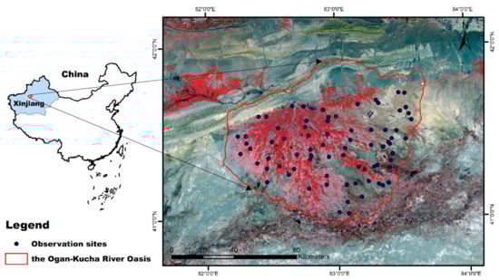 Figure 1 shows that the Ogan-Kucha River oasis is located in the northern part of the Tarim Basin and the southern foot of the Xinjiang Tianshan Mountains (82°10′–83°50′E, 41°06′–41°40′N). The oasis is deposited by alluvial fans and can be divided into three parts: proximal fan, intermediate fan and distal fan. The topography is high in the north and low in the south, sloping from northwest to southeast, and the alluvial fans are ~900 m above sea level. The climate type is continental, warm temperate, arid climate, characterized by drought and little rain, abundant light and heat resources, strong evaporation, and large diurnal differences in temperature. The average annual temperature is 11.6 °C, the average annual precipitation is 52 mm, and the ratio of evaporation to precipitation is 54: 1. The soil types of the oasis are loam, clay loam, sand, sandy loam in descending order of area, and the land cover types are mainly farmland and desert. Natural vegetation is dominated by Populus euphratica, Tamarix chinensis, Phragmites australis, Alhagi sparsifolia, Suaeda glauca, and Kalidium foliatum. The desert on the periphery of the oasis is accompanied by seasonal waterlogging. Oasis crops are dominated by cotton and fruit trees, as well as wheat, corn and other food crops. In the 1990s, managers gradually introduced under-membrane drip irrigation technology to alleviate the adverse effects of salinization on cotton fields. Cotton production has increased to witness the effectiveness of the film, which has reached 100 percent of the entire oasis cotton fields.