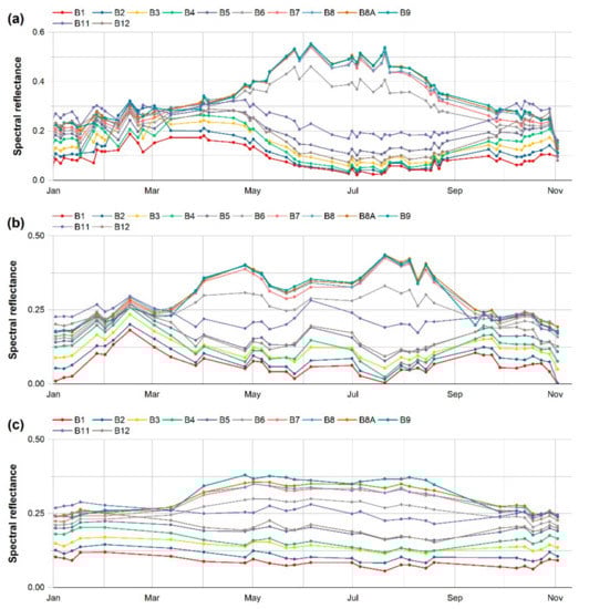 Changes in the mean spectral reflectance of cotton fields (a), fruit trees (b) and wheat (c) during the growing season from the Sentinel 2 satellite image collection.