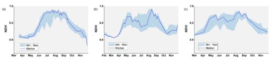 Changes in median NDVI and maximum and minimum values during the growing season for cotton fields (a), fruit trees (b) and wheat (c) based on the Sentinel 2 satellite image collection.