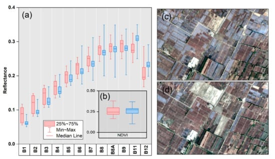 To further clarify the extent to which mulching disturbed the reflectance of the cotton fields, the spectral reflectance of the ground surface before and after mulching was counted, with reflectance from the Sentinel 2 image collection. The results (Figure 6) show that Sentinel 2 images show an increase in bands 1 to 9 after mulching, and a decrease in bands 11 and 12 (Figure 6a). The NDVI box is slightly reduced and can be considered to be little changed (Figure 6b). The true color image of Sentinel 2 appears as a distinct greyish-white image element after covering the ground film (Figure 6c,d). This result suggests that ground cover is a good mutation detection phenomenon during the cotton growing season in Xinjiang, which also indicates that the use of ground cover as a phenological phenomenon is a good indicator for cotton field classification.