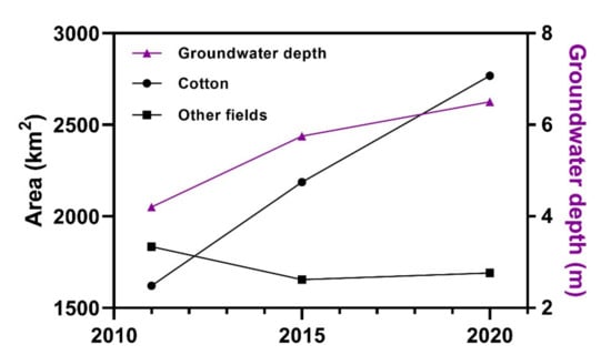 Groundwater depth data are from the groundwater salt monitoring station of the Ogan-Kucha River Basin Management Office in Aksu District, Xinjiang. The area of cotton fields shows an increasing trend and is in line with the change in groundwater depth, while the area of other fields does not change much (Figure 9). The area of cotton fields showed a high correlation with groundwater depth, with a correlation r of 0.979. As the area of cotton fields increased, the groundwater depth became lower, which may be related to the extensive implementation of drip irrigation facilities in cotton fields.