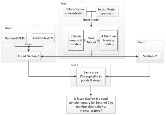 In summary, small water bodies Chla monitoring requires high spatial resolution and high spectral resolution. Therefore, fusing data from Gaofen-6 provides suitable resources for monitoring Chla in small water bodies similar to Sentinel-2. Figure 1 illustrates the technical roadmap of the present study. We will first fuse Gaofen-6 images using Gaofen-6 PMS and Gaofen-6 WFV images to obtain images with the 2 m resolution, eight spectral bands, and 90 km swath width. Secondly, we will compare five semi-empirical models and four machine learning models via simulated reflectance using fused Gaofen-6 and Sentinel-2 spectral response functions. Thirdly, we will choose the best model and apply it in Gaofen-6 and Sentinel-2 images to estimate Chla of the same small water bodies. At last, we will compare the obtained results between fused Gaofen-6 and Sentinel-2.