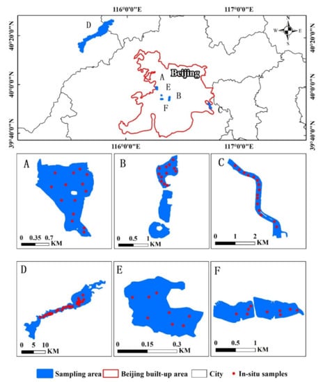 Study area and in situ samples distribution. (A) Summer Palace pond; (B) Beihai Park pond; (C) Grand Canal; (D) Guanting Reservoir; (E) Purple Bamboo Park pond; (F) Yuyuantan Park pond.