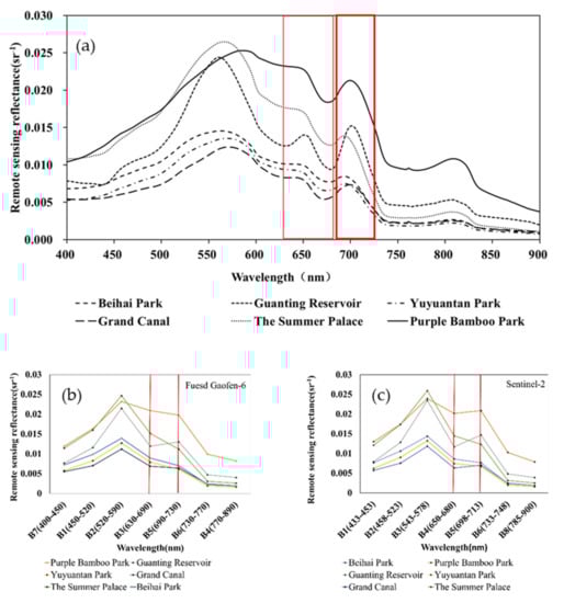 In situ spectra from different in situ samples at the same site are small variations, we enhanced the information on absorption valleys and reflection peaks of in situ spectra with Chla concentrations, we have averaged the spectra from the same site in Figure 3. Figure 3 presents the mean spectra values of our collection study areas, and we discovered that Chla-associated spectral were present in all of these study areas. The absorption valleys and reflection peaks at 675 and 705 nm (Figure 3) were preserved following bandwidth averaging. Furthermore, the two vertical red lines in Figure 3 indicate that the 675 nm and 705 nm features were retained; therefore, the absorption valleys and reflection peaks can be applied to Gaofen-6 and Sentinel-2 images spectrum.