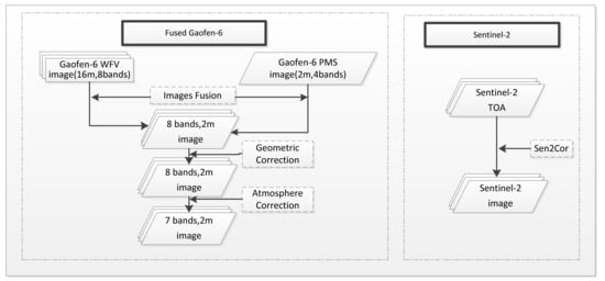 For the fused Gaofen-6, there are the main three steps of image processing: image fusion as well as geometric and atmospheric corrections. The image processing proceeded as illustrated in Figure 4. We first used image fusion to obtain a fused Gaofen-6 with a spatial resolution of 2 m and a spectral resolution of eight bands; then, we performed a geometric correction of the fused Gaofen-6 and Sentinel-2 for a comparative analysis of the two; and finally, we performed an atmospheric correction to complete the pre-processing of the fused Gaofen-6.