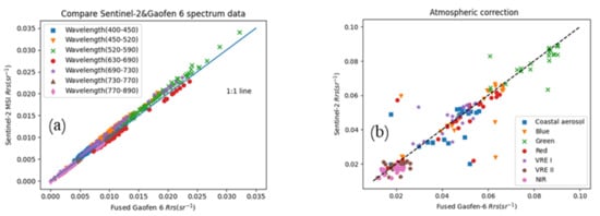 where f(λ) is the relative spectral response function of the Gaofen-6 and Sentinel-2 bands, and and are the wavelength ranges of the spectral response function.