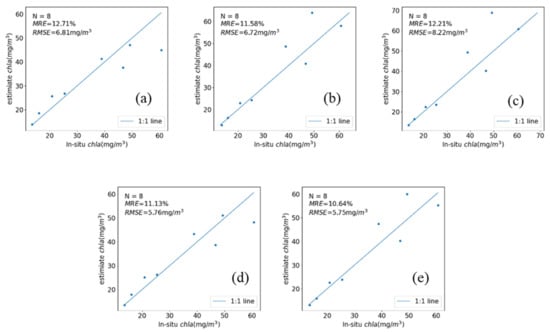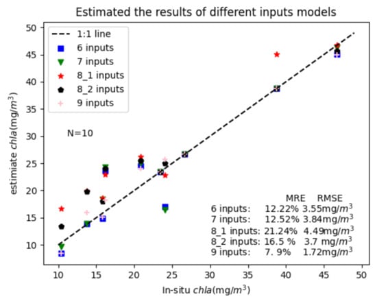 The MRE of six inputs, seven inputs, eight inputs_1, eight inputs_2 and nine inputs were 12.22%, 12.52%,21.24%,16.5% and 7.9%, respectively, and the RMSEs were 3.55 mg/m3, 3.84 mg/m3, 4.49 mg/m3, 3.7 mg/m3 and 1.72 mg/m3, respectively. It was found that nine inputs (seven reflectance bands, two bands of red-edge band, and ratio of red band) worked best in the validation set; therefore, multiple regression input using nine inputs [19] was used to estimate the Chla concentration (Figure 6). The selection of the characteristic band showed that using the Rrs (675 nm)/Rrs (705 nm) ratio in the characteristic band resulted in a remarkably smaller error and further showed a strong correlation between Rrs (675 nm)/Rrs (705 nm) and Chla concentrations.