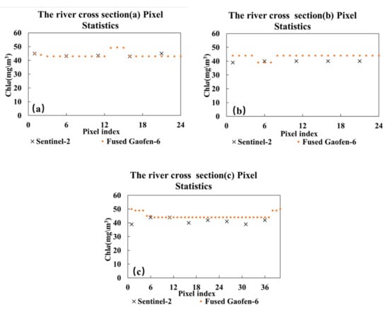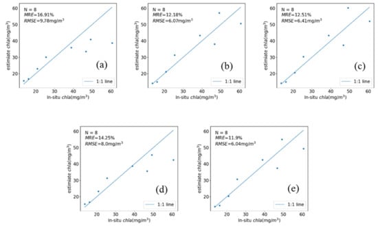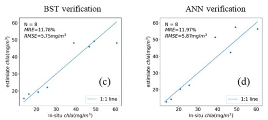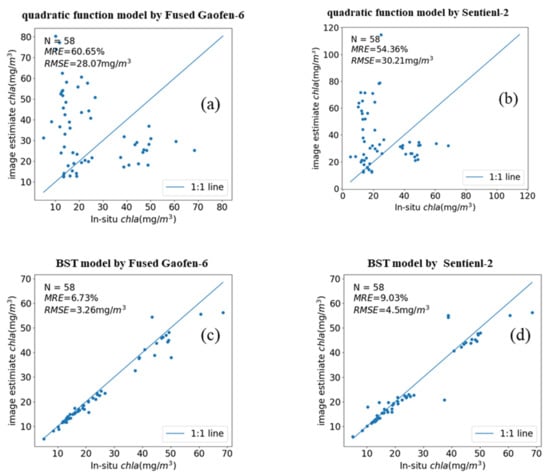 Figure 11 illustrates the quadratic function model reveals a large error in either the fused Gaofen-6 or Sentinel-2 images. The MRE and RMSE were >50% and 28 mg/m3, respectively; it exceeds the maximum allowable error of remotely sensed Chla concentration estimation. However, the BST model exhibited better robustness for both fused Gaofen-6 and Sentinel-2 images. The BST model showed MRE and RMSE values of 6.73% and 3.26 mg/m3 on fused Gaofen-6 images as well as 9.03% and 4.5 mg/m3 on Sentinel-2 images, respectively.