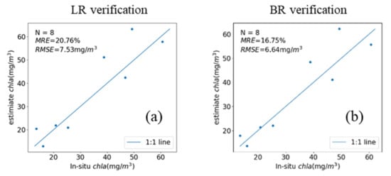 Since no data was obtained from fused Gaofen-6 in 2016, we discarded the sampling points from the Guanting Reservoir, We used in situ points for the period between 21 August 2019 and 25 October 2019, it was during the summer and autumn seasons, and we confirmed that there was no rainfall for five days around the sampling dates. Water Chla concentrations were more stable during the summer and autumn months. Therefore, we used 38 points from the above-mentioned situation and 20 points from the satellite-ground synoptic for image validation. We used the geometric information of the sampled points to extract the band information of the 58 sampled points on the image, and thereafter, used the quadratic function model and BST models for image estimation verification.