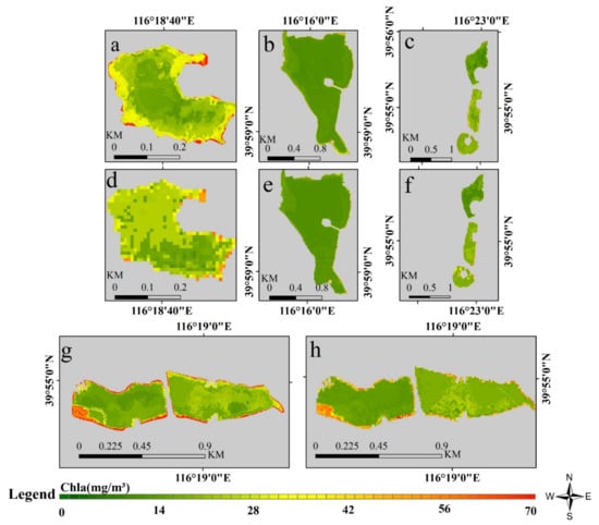 We compared the results of pond Chla concentrations estimated using the BST model for fused Gaofen-6 and Sentinel-2, they are on the same day, 25 October 2019. Within Figure 12, the subplots a, b, c, and g reveal the results of Chla concentration estimation for fused Gaofen-6, whereas the subplots d, e, f, and h exhibit the results of Chla concentration estimation for Sentinel-2. Considering the Purple Bamboo Park pond, the fused Gaofen-6 estimation results (a) showed higher shore (values 50–60) and low distribution of the lake center (the values between 10–20); however, more meticulous space information was obtained. Moreover, Sentinel-2 monitoring (d) results showed higher shore (values 40–55) and low distribution of the lake center (values 15–25), the low spatial resolution of Sentinel-2 leads to salt and pepper noise in the estimation results. The Summer Palace estimation results showed fused Gaofen-6 (b) exhibiting a trend of being higher on the northwest side (the values between 12–14) and similar in other places (the values between 10–12); the results of Sentinel-2 (e) were similar to those of Gaofen-6 estimation. The Beihai Park estimation results showed that both (c and f) exhibited a spatial distribution with high middle (values 15–22) and low sides (10–15). The Yuyuantan Park estimation results showed that the fused Gaofen-6 estimation results (g) exhibited higher shore (values 30–60) and low distribution of the lake center (values 10–20). the spatial patterns in the results from Gaofen-6 and Sentinel-2 (h) are different. They show advantages of Gaofen-6 with high spatial- resolution. Thus, the fused Gaofen-6 estimation produced more detailed spatial information than Sentinel-2 when monitoring the Chla concentrations in small water bodies. Comparing the results of Chla concentrations from the fused Gaofen-6 and Sentinel-2 estimates, only the Purple Bamboo Park pond estimation was inconsistent. This can be explained by the fact that the Purple Bamboo Park pond area was smaller, and Sentinel-2 Salt and Pepper Noise was serious, which indicated different estimation results between the fused Gaofen-6 and Sentinel-2.