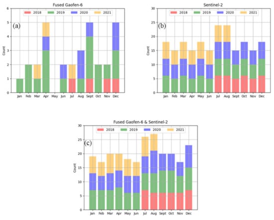 In this study, Gaofen-6 and Sentinel-2 remote sensing images were used. The Gaofen-6 PMS has a spatial resolution of 2 m of the panchromatic band, while the four bands (blue, green, red, and NIR) have a spatial resolution of 8 m. The Gaofen-6 WFV has eight bands (aerosol, blue, green, yellow, red, red-edge I, red-edge II, and NIR) with a spatial resolution of 16 m and a wavelength of 0.45–0.9 nm. Information on Gaofen-6 is available at http://36.112.130.153:7777/DSSPlatform/productSearch.html (accessed on 25 October 2021). Sentinel-2 has 13 bands (aerosol, blue, green, red, red-edge I, red-edge II, red-edge III, NIR, narrow-edge near-infrared, water vapor, short-wave infrared cirrus band, short-wave infrared I, short-wave infrared II), with a wavelength range of 0.43–2.19 nm. Information on Sentinel-2 is available at https://scihub.copernicus.eu/dhus/#/home (accessed on 25 October 2021). Certain bands in Gaofen-6 and Sentinel-2 are remarkably similar (Table 3).