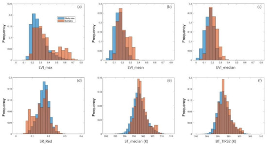 Comparison of the frequencies of six predicted variables between the study area and the samples (a): EVI_max, (b): EVI_mean, (c): EVI_median, (d): SR_Red, (e): ST_median, (f): BT_TIRS2.