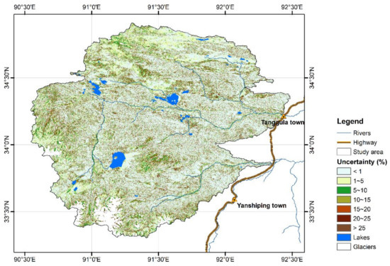 The dominant vegetation in the study area is AS and AD, accounting for 40.2% and 34.0% of the total study area, while AM and ASM account for 19.0% and 2.5%, respectively. The ASM and AM usually showed a patchy and discontinuous distribution. The average uncertainty of the map was 6.4%, and those of ASM, AM, AS, and AD were 6.8%, 5.9%, 7.2%, and 5.8%, respectively. The areas with high uncertainties mainly occurred in the transition zone between different types, especially for the boundaries of AM and AS, and in the areas with rapid type changes within short distances. The results of this study showed that the RF approach can effectively and accurately realize the vegetation classification of permafrost regions on the QTP. Based on a spatial resolution of 30 m, the results can provide more detailed vegetation information than the existing maps, which will be helpful for further permafrost modeling in this region.