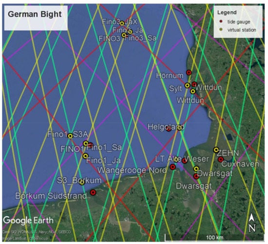 Here, we aim to assess the accuracy of recent altimeter missions in the German Bight by comparing altimetry with tide gauges controlled by global navigation satellite systems (GNSS) measurements. In contrast to previous work in the region [,,,], our study is more comprehensive, as it evaluates six altimeter missions and uses data from 11 high-rate tide gauge stations since 2002. The focus is on the mission biases and the precision of the instantaneous height measurements. CalVal at non-dedicated stations can be hampered by poorly known differences in ocean dynamics between the two sensor locations. Therefore, an empirical model is introduced to align the two data sets. For an assessment of altimetric accuracy on seasonal to decadal time scales in the region, the reader is referred to [].