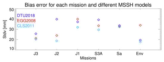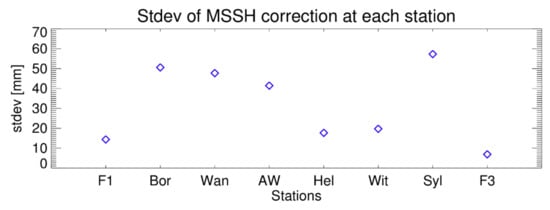 Regional mission biases were derived relative to eight GNSS-referenced tide gauge stations with good agreement between altimetry and gauge data (Table 4). The biases range between −39 cm and 4.4 cm. The absolute numbers differ by several cm from the values derived at dedicated CalVal stations. However, apart from orbit-related geographically correlated errors, the biases are to some extend dependent on the chosen retracker and correction models (especially sea state bias). The bias estimated at Helgoland for Sentinel-3A by [] agrees within a few mm with our estimation. Having applied the mean and time variable position corrections, the accuracy of the regional mission biases is between 1.3 and 3.4 cm. This is in the same order of magnitude as the less than 2 cm reported by [] but considerably more than the 0.5 cm reached at Corsica []. The analysis shows that the accuracy is very sensitive to the MSSH model used for the mean position corrections. The best results are obtained with the CLS2011 model, followed closely by the DTU2018 model. The most recent models CLS2015 and DTU2021 are far less suited for this application. Hence, the accuracy of the biases could be further increased by either eliminating problematic stations more stringent from the analysis and by enhanced MSSH models.