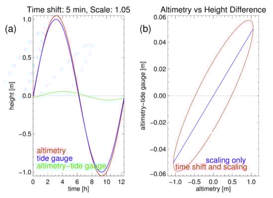 Sketch showing (a) two idealized M2 sea-level series with a slightly different phase (5 min offset) and amplitude (1 m/1.05 m), and (b) the difference between the two series in dependence on the sea level for amplitude scaling (blue) and amplitude scaling plus time shift (red).