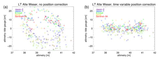 Difference between altimetry and tide gauge as function of absolute height for the five missions available at station LT Alte Weser (a) without and (b) with time variable position correction (Δt: 14–19 min., scaling factor: 1.02–1.06).