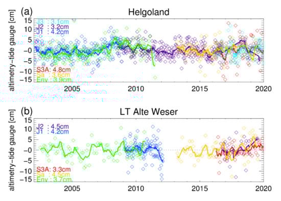 Difference between altimetry and tide gauge at stations (a) Helgoland (open water) and (b) LT Alte Weser (coastal) for up to six missions (color coded) with time variable position correction applied. Diamonds mark single measurements, thick lines are the 3 months box-car filter, RMS-D values are given at the left-hand side and missions are color coded.