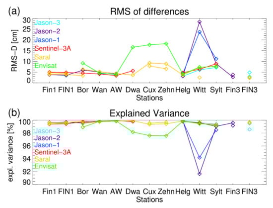 The explained variance and RMS-D counterclockwise along the coast for all missions is shown in Figure 7. The explained variance is more than 90% everywhere, and at most stations it is even more than 98%. The RMS-D is less than 5 cm almost everywhere, and even at Dwarsgat (mouth of river Weser) the RMS-D is still less than 10 cm for the recent missions. The best agreement between tide gauge and altimetry is found at the open water stations Fino1, FINO3 and Helgoland and for the Sentinel-3A and Envisat missions at the coastal station LT Alte Weser. For most coastal stations and for older missions (Envisat, Jason-1), the agreement is diminished. At the virtual stations Zehnerloch, Dwarsgat and Wittdün, the data are frequently missing and exhibits excessive internal RMS of the high-frequency data. This suggests problems to retrack the height at these locations reliably, especially for the older missions. At Dwarsgat there are no valid data for low water, and at Wittdün data are missing, especially during winter for high sea states. The first tests suggest that the data outcome and the RMS-D can be improved by using different (ICE1, SEAICE) retrackers (not shown). At the virtual stations SYLT, Wittdün and BORKUM, the time variable position correction has high values, indicating that the tidal dynamics differ considerably between tide gauge and the virtual station. In fact, the corresponding tide gauge stations are located on the landward side of islands and are therefore less suitable for the validation of altimetry.