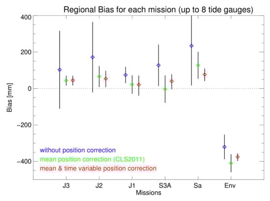 Every altimeter mission is subject to global mean bias, which is related to internal sensor delays. In addition, there are regional biases that are dominated by geographically correlated orbit errors with possible contributions from regional biases of correction models. Here, the regional mission biases are estimated relative to the absolute referenced tide gauge stations. The accuracy of the regional mission biases corresponds to the variance of the biases estimated at different stations. We omitted three station pairs with minor agreement of the time variable component (Zehnerloch/Cuxhaven, Dwarsgat) from the analysis. Depending on the mission, there were still three to eight collocated tide gauges available. Figure 8 shows the resulting regional mission biases derived with and without position corrections. Both position corrections influence the bias values and diminish the uncertainty considerably from 10–20 cm to 1.3–3.4 cm. The regional biases and the corresponding error margins are given in Table 4.