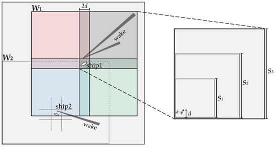 The length of the subwindow is set as a multi-scale window, so that wakes of different lengths can be detected. In addition, to cover the offset d due to the Doppler shift, an overlap width of 2d is set between the windows. The offset d can be calculated by [40,41]: