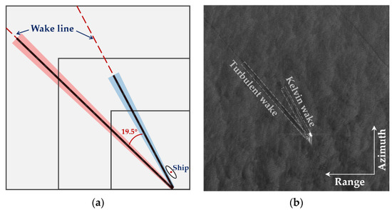 Wakes generated by ships during navigation can generally be divided into Kelvin wakes, internal wave wakes, turbulent wakes and V-narrow wakes, and they show different geometric characteristics [36], as shown in Figure 1a. Actually, ship wakes in SAR images are mainly turbulent wakes and Kelvin wakes, with Kelvin wakes accounting for about 17% of wakes. Turbulent wakes are the most common wake type and exist in almost all ship wakes [37]. They are characterized by dark or bright narrow lines that stretch for tens of kilometers in length; these ships generally show the highlight point or region.