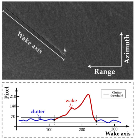 Measuring the length of the wake is determining the start and end positions of the wake. Unlike sea clutter, the wake area has obvious pixel characteristics. In order to separate the wake pixels from the sea clutter pixels, the statistical pixel characteristics of the sea clutter in the corresponding subwindow are selected as the parameters to distinguish the wake lines from the sea clutter [20].