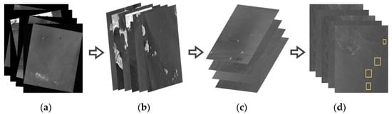 Creation of multi-ship and multi-scale wake data sets: (a) SAR images; (b) preselect the images with ship wakes; (c) crop sub-images with multiple ships and multiple wakes; (d) labeled sub-images.