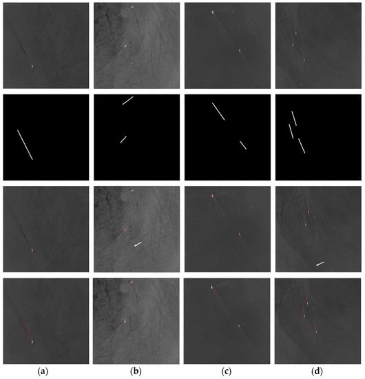 Some SAR samples and detection results of the ship wake: (a) Single wake; (b–d) Multiple wakes.