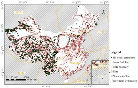 China’s mainland is located at the intersection of the Alpine-Himalayan and Circum-Pacific seismic zones, where destructive earthquakes occur frequently []. Seismicity in China’s mainland is characterized by high frequency, wide distribution, great intensity, shallow seismic focus, and clear regional differences. Most earthquakes in this area are shallow focus earthquakes that occurred within the continental crust, whose principal type are strike-slip type []. Based on statistical data from the Earthquake Science Knowledge Service System (http://earthquake.ckcest.cn/earthquake_n/dzml/ch5.html, accessed on 15 July 2021), we developed a chart of the spatial distribution of historical earthquakes in China’s mainland. Figure 1 shows the positions of plates and all earthquakes over 4.0 that have occurred in China’s mainland since 1950. These earthquakes are widely distributed in China’s mainland and the spatial pattern of seismic activities in this area is featured by strong activities in the west and weak activities in the east.