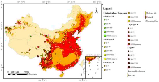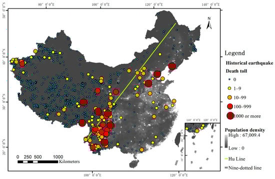 With an area of 9.6 million square kilometers (including Taiwan Province), China has diverse natural and human geographical environments that differ in terms of climates, landforms and geological conditions in China; hence, it is difficult to build a single seismic casualty prediction model that is suitable for the whole area. Seismic destructive effects in this vast area are obviously regional. Figure 2 shows the distribution of population and historical earthquakes in China’s mainland. The frequency of earthquakes and life losses caused by these disasters are roughly bounded by a population dividing line called the Hu Line []. To the east of the Hu Line, earthquakes have caused lager death tolls than those to the west of this boundary, although high seismicity has been observed in the west. Since 1949, 19 provinces in China’s mainland suffered deaths due to earthquakes, among which Hebei, Sichuan, and Yunnan Provinces suffered the most life loss events, accounting for more than 90% of all casualties [].