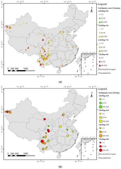 Spatial distributions of the earthquake case dataset: (a) Training samples; (b) testing samples.
