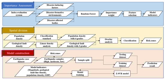 As an extension of support vector machine (SVM) for solving regression problems support vector regression (SVR) has attracted much attention in the field of machine learning and displayed strong predictive ability in mortality evaluation. Compared with other machine learning algorithms, SVR can achieve the optimal solution with a small number of samples and avoid problems such as overfitting and local extremum as much as possible, which makes its generalization ability and performance stand out []. However, as a machine learning method that is based on historical statistics, it may be difficult for the SVR model to accurately predict casualties due to earthquakes occurring in different regions of the study area, especially those with vast acreage and diverse environments. Therefore, based on the characteristics of SVR and regional differences in the study area, we constructed a zoning SVR model (Z-SVR) for various regions in the study area; for which the optimal model parameters for all risk zones were identified using training samples from the earthquake case dataset.