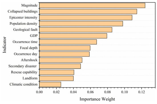 Seismic fatality is a comprehensive result that is influenced by diverse factors, and whether a factor has a decisive impact on earthquake casualties is an essential question for feature selection of prediction models []. Therefore, before constructing a prediction model for earthquake casualties, it is crucial to establish a reasonable index system and analyze the importance of relevant indicators, which will serve as a reference for the prediction model to select more important features. Based on regional disaster system theory, this study established an evaluation index system for 14 major features that affect earthquake fatality. We used the earthquake case dataset and the random forest model to assess the importance weights of features, of which the ranking served as an important reference for feature selection of the prediction model.