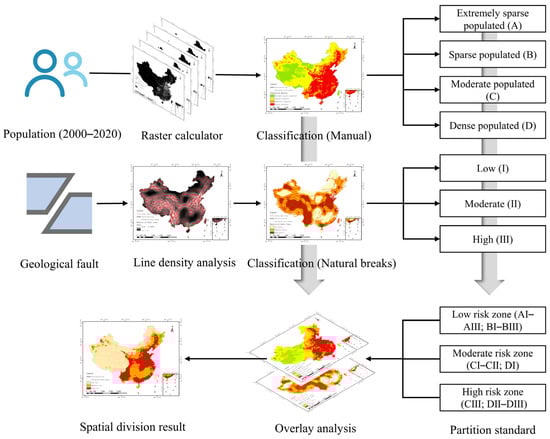 Overlay analysis is a frequently used geographic computing operation and a significant spatial analysis tool in GIS software, which is widely used in applications that are related to spatial computing []. This operation integrates different data layers and their corresponding attributes in the study area, which connects multiple spatial objects from multiple data sources and quantitatively analyzes the spatial range and characteristics of the interactions among different forms of spatial objects. Based on the feature selection results, geological faults are the birthplace of an earthquake, and humans are the victims of seismic disasters. In earthquakes with similar seismicity, denser strata fault lines and higher population density will lead to a greater risk to personnel safety []. For the above reasons, this study divided the study area into parts according to the variations in population density and strata fault density and established a corresponding partition standard. We developed a comprehensive partition standard that was used to overlay the classification results. Then, we divided the study area into risk areas of three grades: low risk, moderate risk, and high risk zones. The theory and procedure of the proposed spatial division method are illustrated in Figure 9.
