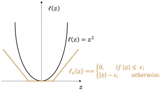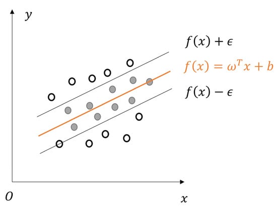 The SVR algorithm is explained as follows. Consider a given training sample set , where , is the th sample and has feature dimensionality , is the value of the th feature, is the corresponding target value of the th sample, and is the number of samples. The goal of SVR is to find a regression model such that is close to its corresponding target value , where and are parameters to be calculated. In the traditional regression model, the function loss is calculated based on the difference between and , which is too strict and will eventually lead to overfitting []. To overcome this disadvantage, SVR sets a maximum deviation between and , and the function loss is counted only when the difference between and is greater than (Figure 10). This is equivalent to constructing a spacer band of width with as the center; when the training sample is within the spacer band, the prediction result will be designated as correct []. Therefore, the SVR problem can be formulated as