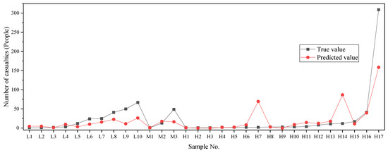 Judging from the stability of the prediction results on the training samples, all models performed relatively better in low and moderate risk zones than in high risk zones. A possible explanation is that there are 64 training samples in high risk zones, much more than in low and moderate risk zones. In addition, the true numbers of casualties in these 64 samples vary from 1 to 748, which is a huge range and increases the difficulty for machine learning models to achieve accurate prediction. Among all prediction models, Z-LR performed the worst, as its RMSE and MeaAE were 83.37 and 52.72, respectively, which ranked last in the two evaluation indicators. Z-BP and Z-RF outperformed the Z-LR model, with RMSEs of 67.30 and 74.27, respectively, and MeaAEs of 42.80 and 49.17, respectively. In contrast to the above prediction methods, Z-SVR showed higher overall accuracy in cross-validation experiments for all risk zones. Its RMSE was 59.15, and its MeaAE was 36.16, which were significantly lower than those of the compared models; this indicates that the proposed Z-SVR model had the smallest dispersion and the highest stability.