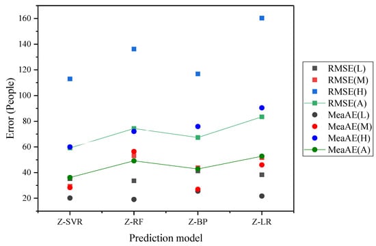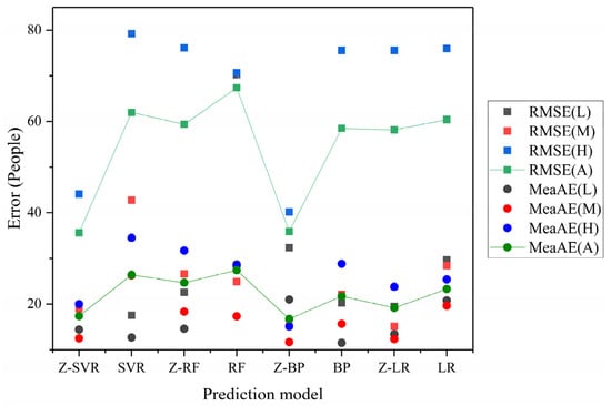 The robustness of each model was evaluated using the cross-validation method. As discussed in Section 2.2.1, 113 seismic cases were selected as the training dataset, among which 49 cases were in low risk areas, 13 in moderate risk areas, and 81 in high risk areas. We randomly divided the cases in low and high risk zones into ten groups, respectively; considering the limited number of samples, we randomly divided the cases in moderate risk zones into five groups. The sample data in each group were not repeated. We used RMSE and MeaAE to compare the regression precision between the Z-SVR model and other machine learning models using the spatial division method. RMSE and MeaAE were calculated for three degrees of risk zones (L, M and H) and the average values (RMSE(A) and MeaAE(A)) were also given. The comparison result of all models is shown in Figure 14.