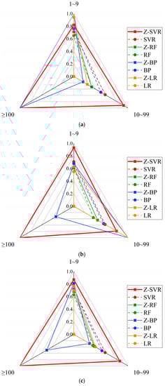 We also divided the testing samples into three groups according to the number of casualties, where the division criterion was order of magnitude (1 to 9, 10 to 99, 100 and greater). We compared the classification performances of Z-SVR and other models in the groups and calculated the evaluation indicators of , , and for all prediction models. Figure 16 presents the comparison results of classification performance between Z-SVR and other models on samples with various numbers of casualties. Z-SVR provided the most balanced and accurate classification into the three groups. Although models such as Z-BP and Z-LR showed better classification performance in terms of or in some groups, the and values of the Z-SVR model in the three groups were high, balanced and stable; thus, Z-SVR had the highest values in each group. In general, the Z-SVR model was the most precise and stable model, which provided accurate classification results for earthquakes with various numbers of casualties.