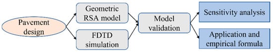 The objective of this paper is to develop and validate a simulation model of GPR surveys on a heterogeneous and non-dry AC mixture to allow studying the effect of internal moisture content on reflected GPR signals. To achieve that, a four-phase heterogeneous model—aggregate, binder, water, and air voids—of AC pavement was randomly generated based on the mixture volumetric properties. An FDTD model was developed to simulate virtual GPR surveys on AC pavement. Experimental data from field tests were used to validate the simulation model. The effects of moisture content on GPR signals and mixture dielectric constant were investigated. In addition, a quantitative relationship between moisture content and bulk dielectric constant was derived from simulation and an application for moisture content prediction was presented herein. A flowchart of the proposed method is shown in Figure 1.