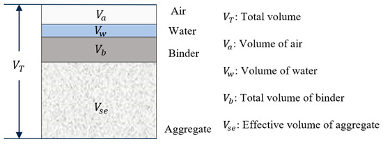 The saturation ratio, , is defined as the ratio between the volumes of water and all voids (water and air voids) (Equation (1)). From Figure 2, the volume of voids in AC mixtures is the summation of the volumes of the air voids, , and water, .