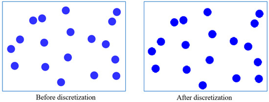 To accommodate to the grid shape in the FDTD model in the next step, the simulation domain is discretized using elements of a unit square, and the generated spherical particles are approximated using the unit squares. Figure 3 shows an example of the particles before and after the discretization. According to the RSA algorithm, the simulation domain will reach to a jamming limit in which no particles can be adsorbed any more [39]. Given that the depositing particles are polydisperse, the jamming usually occurs during the generation of fine aggregate. Once the jamming limit is reached, the aggregate gradation is checked, and unit squares are complemented as fine aggregate. After the generation of aggregates, the positions of unit squares are stored and labeled as aggregate.