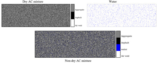 Visualization of a heterogeneous dry AC mixture, water component, and a non-dry AC mixture numerical model.