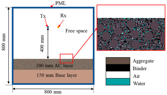 A virtual 2D AC pavement with AC surface and base layers was constructed in GprMax. The AC layer was replaced with the heterogeneous model generated by the RSA method. The diagram of the FDTD model is shown in Figure 4. Tx is the transmitter antenna, and Rx is the receiver antenna. Depicting the actual distance between the transmitter and receiver, the distance between the transmitter and receiver antennas was set at 0.38 m in the simulation. The excitation of the antenna was a hertzian dipole with the Ricker function as the excitation signal. The model was discretized using a grid with spatial steps of . The perfect matched layer (PML) was used to cancel out any reflections upon its interface. The model with PML can simulate the EM wave propagation in an infinite space [41]. Model dimensions are shown in Figure 5.